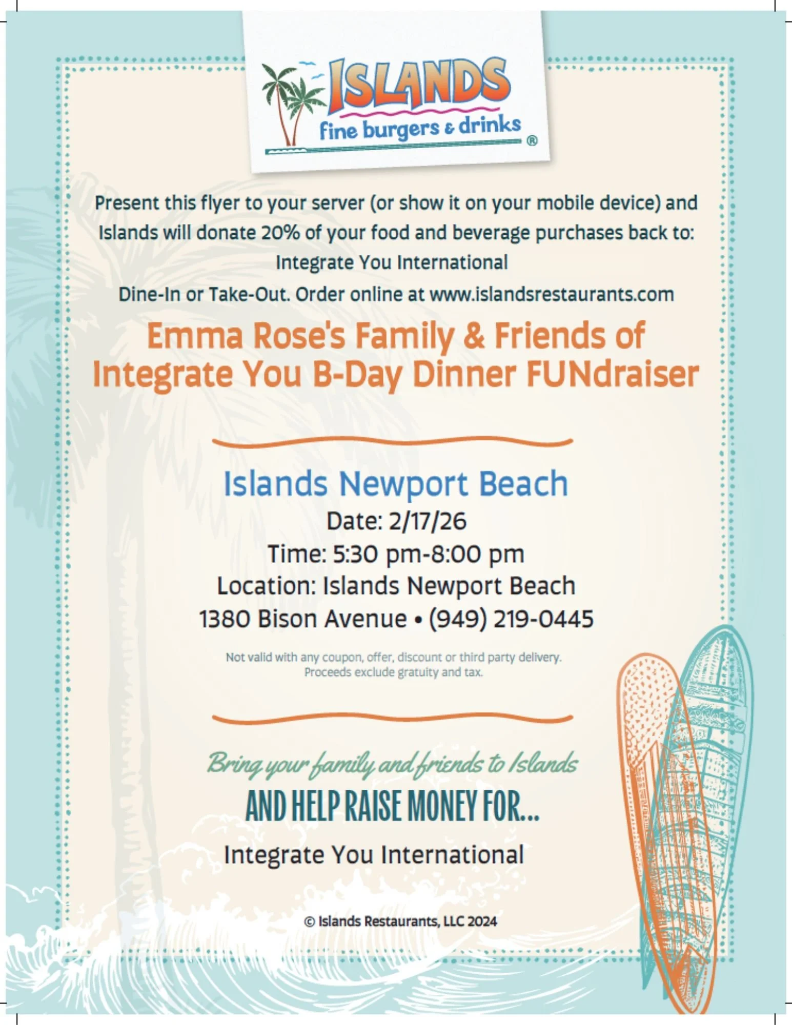 Join us for my Family & Friends of Integrate You Birthday Dinner FUNdraiser at Islands in Newport Beach on my actual 37th birthday!