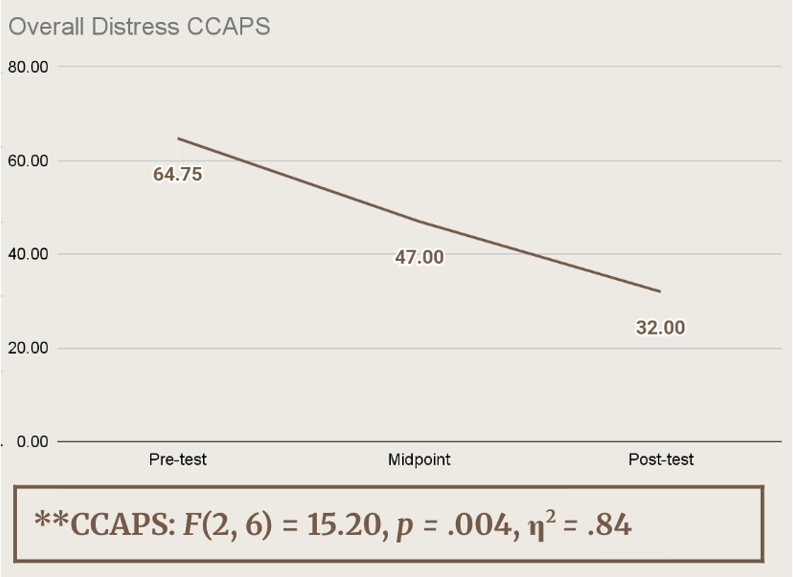 Statistically significant CPTSD symptoms showed one of the largest changes (F = 10.08, p = .01, η² = .77)